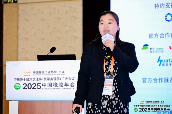 山東京博中聚新材料有限公司技術(shù)創(chuàng)新中心總經(jīng)理李蘭閣,介紹了京博中聚的高性能橡膠材料,如鹵化丁基橡膠等,闡述可持續(xù)發(fā)展路線和生物基產(chǎn)品成果,呼吁行業(yè)共同推動(dòng)新產(chǎn)品應(yīng)用。