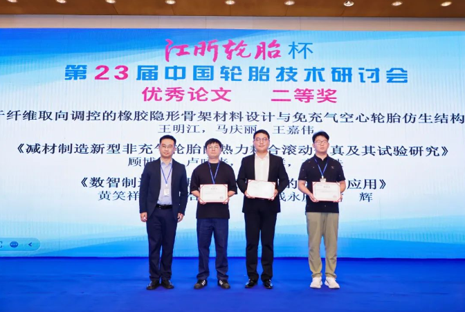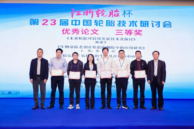 經(jīng)與會代表投票和專家評審委員會審議,大會評選出10篇優(yōu)秀論文。貴州輪胎股份有限公司高曉松的《基于科學(xué)碳目標倡議(SBTi)標準下的輪胎行業(yè)低碳可持續(xù)發(fā)展初步實踐》榮獲優(yōu)秀論文一等獎并獲“江昕輪胎杯”,江蘇江昕科技股份有限公司王明江等的《基于纖維取向調(diào)控的橡膠隱形骨架材料設(shè)計與免充氣空心輪胎仿生結(jié)構(gòu)研究》等3篇論文榮獲優(yōu)秀論文二等獎,山東華盛橡膠有限公司陳建軍等的《未來輪胎可持續(xù)發(fā)展技術(shù)及探討》等6篇論文榮獲優(yōu)秀論文三等獎。