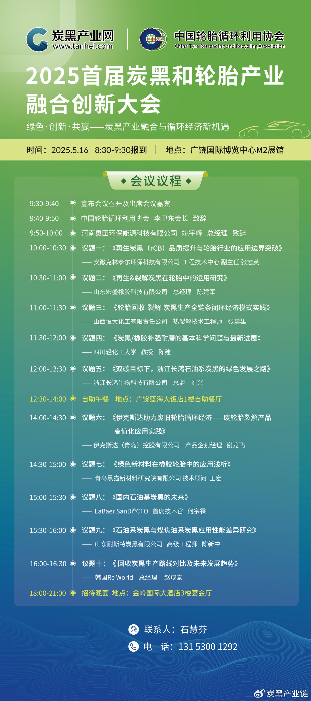 由炭黑產(chǎn)業(yè)網(wǎng),中國(guó)輪胎循環(huán)利用協(xié)會(huì)聯(lián)合舉辦的“2025首屆炭黑與輪胎產(chǎn)業(yè)融合創(chuàng)新大會(huì)”定于2025年5月16日在廣饒舉辦。本屆會(huì)議主題是“綠色·創(chuàng)新·共贏--炭黑產(chǎn)業(yè)融合與循環(huán)經(jīng)濟(jì)新機(jī)遇”。