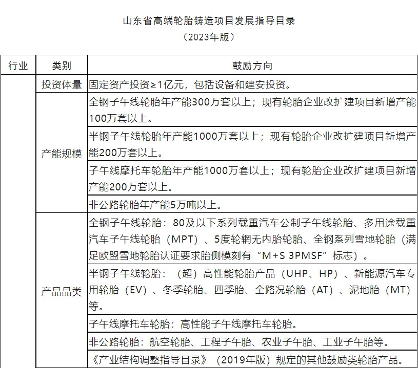 通知中明確提出,為支持高端項(xiàng)目的快速發(fā)展,將適時(shí)進(jìn)行《山東省高端輪胎鑄造項(xiàng)目發(fā)展指導(dǎo)目錄(2023年版)》的調(diào)整。對(duì)屬于《目錄》范圍內(nèi)的新上高端輪胎項(xiàng)目,不再受之前《關(guān)于“兩高”項(xiàng)目管理有關(guān)事項(xiàng)的補(bǔ)充通知》規(guī)定的產(chǎn)能、能耗、碳排放替代政策限制,有望進(jìn)一步釋放高端輪胎領(lǐng)域的發(fā)展?jié)摿Α?/p>