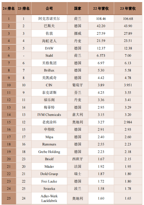 據(jù)炭黑產(chǎn)業(yè)網(wǎng)了解,盡管Grebe Holding旗下的Weilburger涂料公司在2023年的營業(yè)額仍然使其位列前25名,但由于該公司近期被關(guān)西集團收購,因此在未來的排名中可能將不再出現(xiàn)。