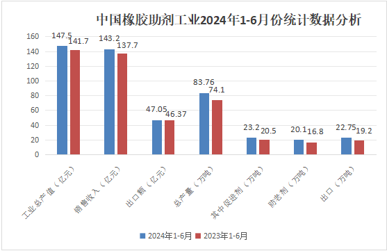 2024年1-6月份工業(yè)總產(chǎn)值147.5億元,同比增長4.9%;銷售收入143.2億元,同比增長3.99%;出口額47.05億元,同比增長1.47%;總產(chǎn)量83.76萬噸,同比增長13.04%;出口量22.75萬噸,同比上漲18.49%;其中橡膠促進(jìn)劑23.2萬噸,同比上漲13.17%;橡膠防老劑22.75萬噸,同比增長18.49%。
