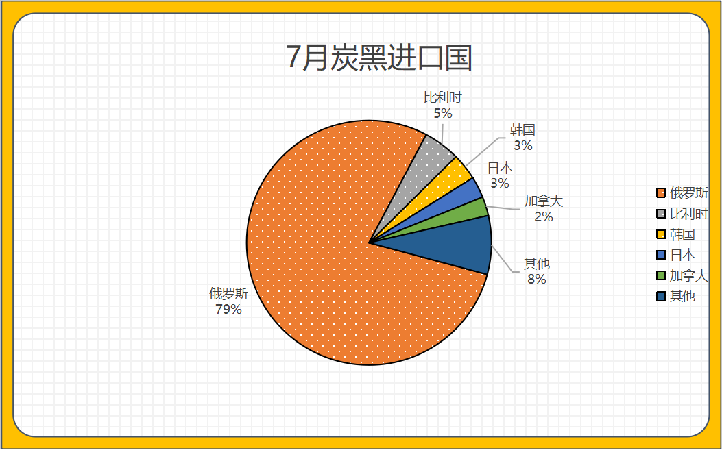 2024年7月炭黑進(jìn)口數(shù)量前三名地區(qū)為:俄羅斯、比利時(shí)、韓國;分別占總進(jìn)口量79%、5%、3%。