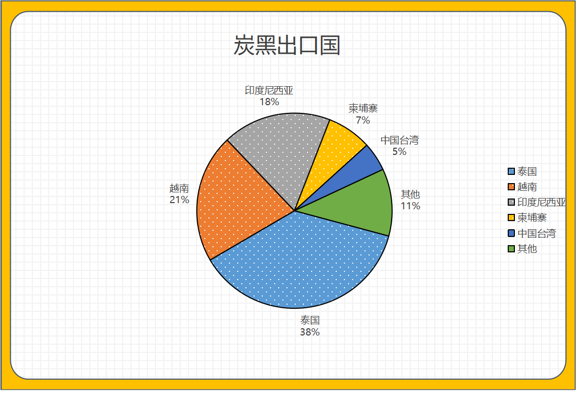其中2024年7月炭黑出口數(shù)量前三名地區(qū)為:泰國、越南、印度尼西亞;分別占總出口量38%、21%、18%。
