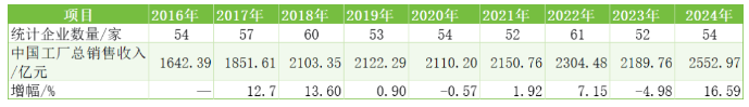 表1 2016~2024年度中國境內輪胎排名企業(yè)銷售收入變化情況