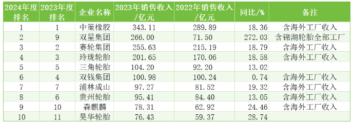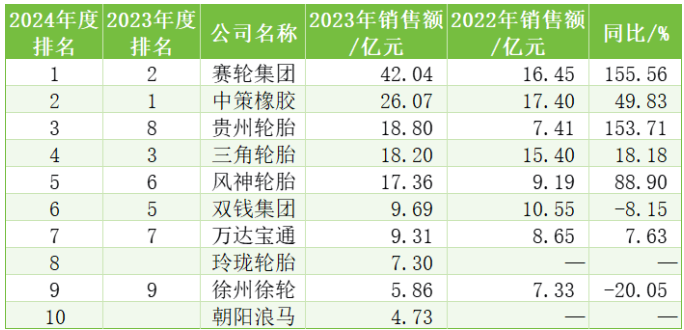 表6 2024年度中國輪胎企業(yè)排行榜前10強情況