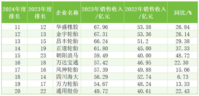 表7 2024年度中國輪胎企業(yè)排行榜前11-20強情況