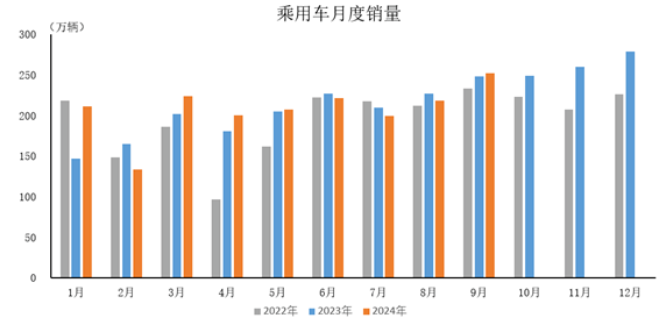 2024年9月,乘用車產(chǎn)銷分別完成250.2萬輛和252.5萬輛,環(huán)比分別增長12.6%和15.8%,同比分別增長0.2%和1.5%。2024年1-9月,乘用車產(chǎn)銷分別完成1864.3萬輛和1867.9萬輛,同比分別增長2.6%和3%。