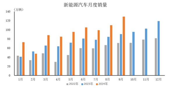 2024年9月,新能源汽車產(chǎn)銷分別完成130.7萬輛和128.7萬輛,同比分別增長48.8%和42.3%。2024年1-9月,新能源汽車產(chǎn)銷分別完成831.6萬輛和832萬輛,同比分別增長31.7%和32.5%。