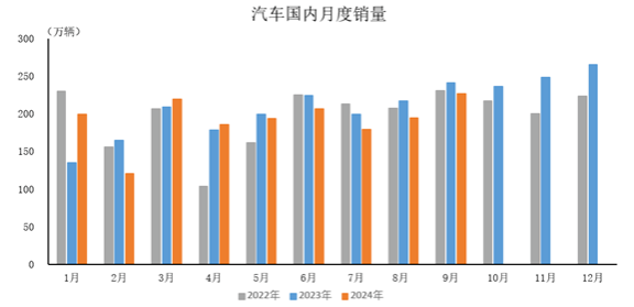 2024年9月,汽車國內(nèi)銷量227萬輛,環(huán)比增長16.9%,同比下降6%。2024年1-9月,汽車國內(nèi)銷量1725.9萬輛,同比下降2.4%。