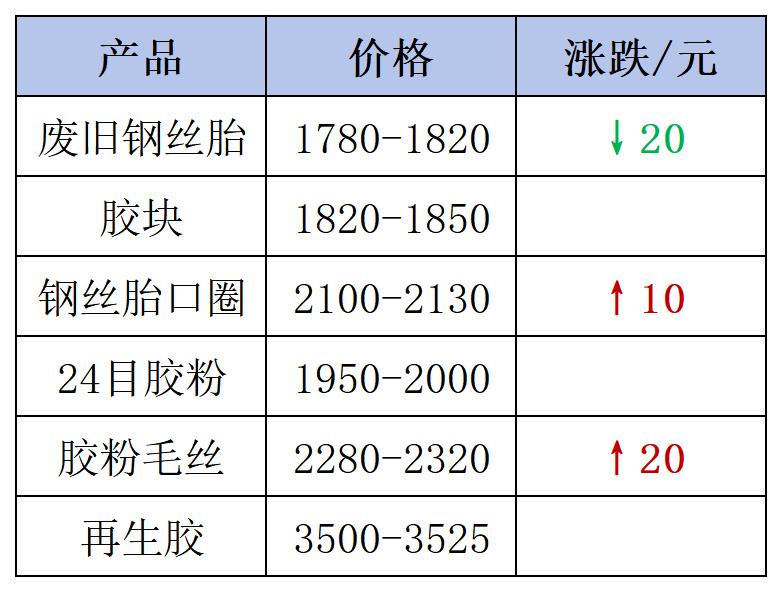 最近廢鋼價(jià)格回彈,利好行業(yè)行情,毛絲、口圈鋼絲價(jià)格微漲;再生膠和膠粉因訂單有限,價(jià)格持穩(wěn)。廢舊鋼絲胎目前貨源緊缺,下游廠家多按需采買,周內(nèi)價(jià)格雖承壓下跌,但跌幅受限。