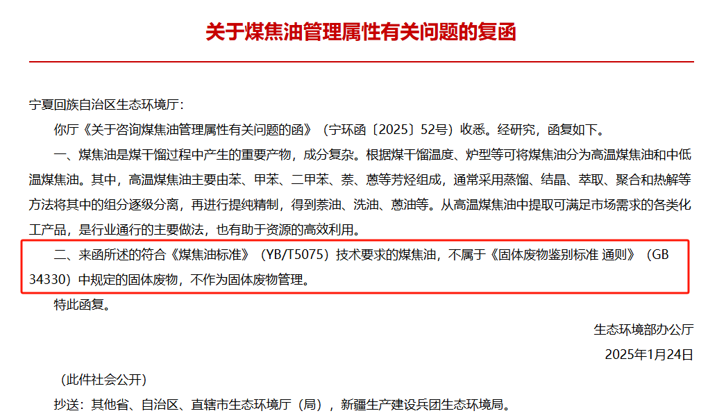另外,1月1日新實(shí)施的《國(guó)家危險(xiǎn)廢物名錄(2025年版)》中,也將原本被列為危險(xiǎn)廢物的“煤炭焦化、氣化及生產(chǎn)燃?xì)膺^(guò)程中產(chǎn)生的滿(mǎn)足《煤焦油標(biāo)準(zhǔn)》(YB/T5075)技術(shù)要求的高溫煤焦油”正式從危險(xiǎn)廢物名錄中剔除。