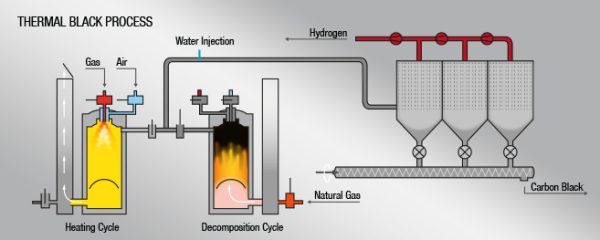 熱解法采用兩臺生產(chǎn)爐為一組的批量生產(chǎn)工藝。在這組爐子中,一臺爐子處于蓄熱階段,而另一臺則處于生產(chǎn)階段,兩者交替進(jìn)行。首先,向爐內(nèi)通入空氣和燃料氣進(jìn)行燃燒,待爐子溫度升至1300-1500℃后,停止供應(yīng)燃料氣和空氣,完成蓄熱階段。隨后,通入原料,利用爐內(nèi)蓄積的熱量進(jìn)行高溫裂解,從而生成炭黑。