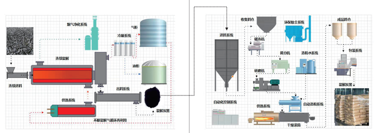 廢舊輪胎裂解技術(shù)原理是在無氧或氮氣條件下,將廢舊輪胎高溫裂解成裂解油、裂解氣、裂解炭黑和鋼絲,然后將裂解炭黑進(jìn)行深加工,裂解炭黑依次經(jīng)過貯存、磁選、超細(xì)研磨、混合、改性、造粒、烘干和包裝等工藝流程,獲得高附加值產(chǎn)品。