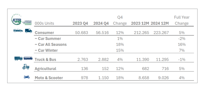 數(shù)據(jù)顯示,2024年乘用車輪胎的銷量有所提升,這主要得益于全季節(jié)輪胎的強勁需求。然而,盡管乘用車輪胎市場有所改善,但與疫情前的水平相比,銷量仍然較低。與此同時,卡車輪胎市場則繼續(xù)承壓,銷量同比2019年下降了10.3%,顯示出市場復蘇的艱難。