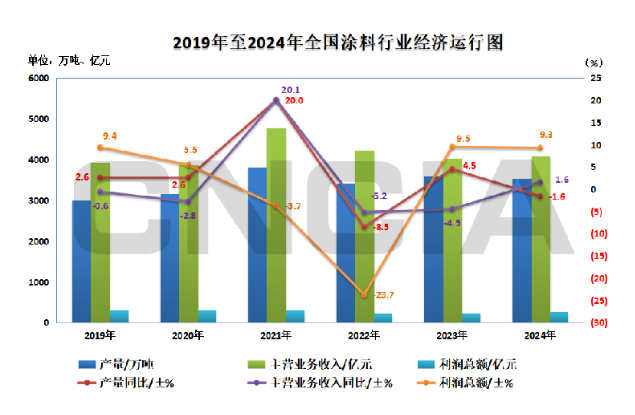 2024年整體發(fā)展: 2024年,中國(guó)涂料行業(yè)總產(chǎn)量、主營(yíng)業(yè)務(wù)收入基本穩(wěn)定??偖a(chǎn)量3534.1萬(wàn)噸,同比降低1.60%;主營(yíng)業(yè)務(wù)收入4089.03億元,同比增長(zhǎng)1.56%。行業(yè)在結(jié)構(gòu)調(diào)整和產(chǎn)品升級(jí)上取得進(jìn)展,高端、功能性涂料產(chǎn)品占比提高,利潤(rùn)總額增長(zhǎng)至262.9億元,同比增長(zhǎng)9.34%。