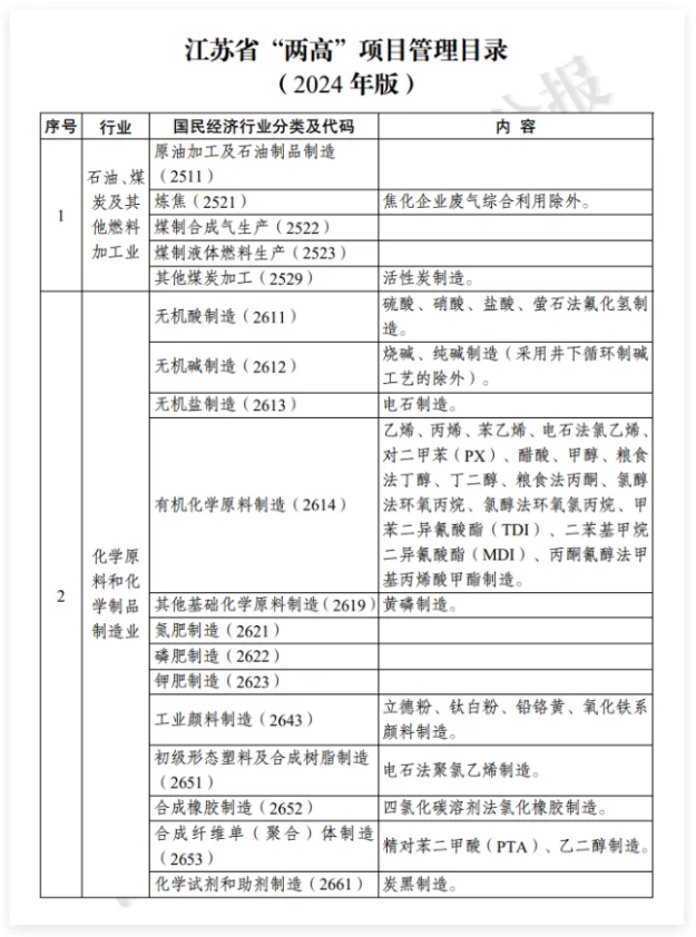江蘇省“兩高”項目管理目錄(石化化工行業(yè))