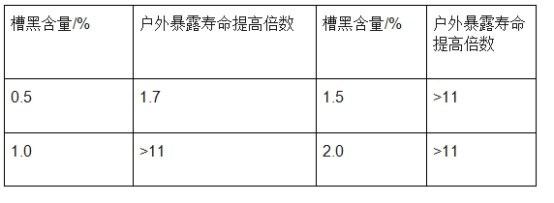 下圖是槽法炭黑含量對(duì)HDPE(高密度聚乙烯)戶外壽命的影響