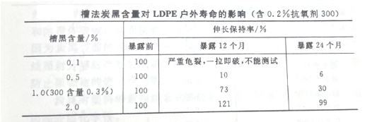 下圖是下圖是槽法炭黑含量對(duì)LDPE(低密度聚乙烯)戶外壽命的影響
