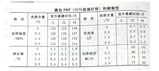 下圖是黑色PBT的耐候性數(shù)據(jù),從表中可以看到,炭黑加入可以使PBT的拉伸強(qiáng)度稍稍下降,但經(jīng)室外光老化三年(炭黑含量3%),強(qiáng)度幾乎不變。